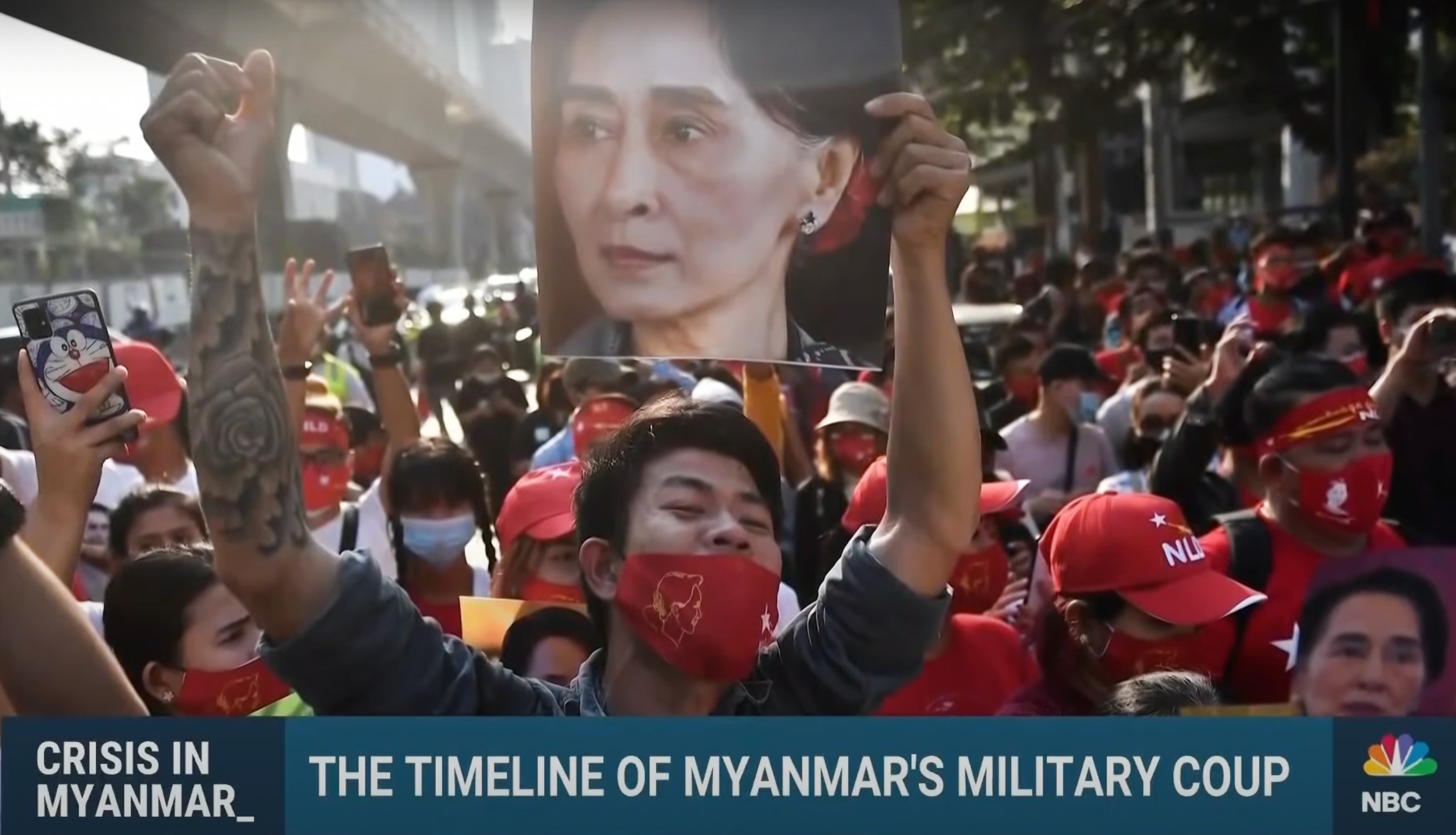 2020년 11월 총선 결과에 불복한 미얀마 군부가 쿠데타를 일으키자, 이에 저항하는 시위대가 전 미얀마 국가고문인 아웅 산 수치의 사진을 들고 항의하고 있다. ©NBC 뉴스 보도화면 캡처