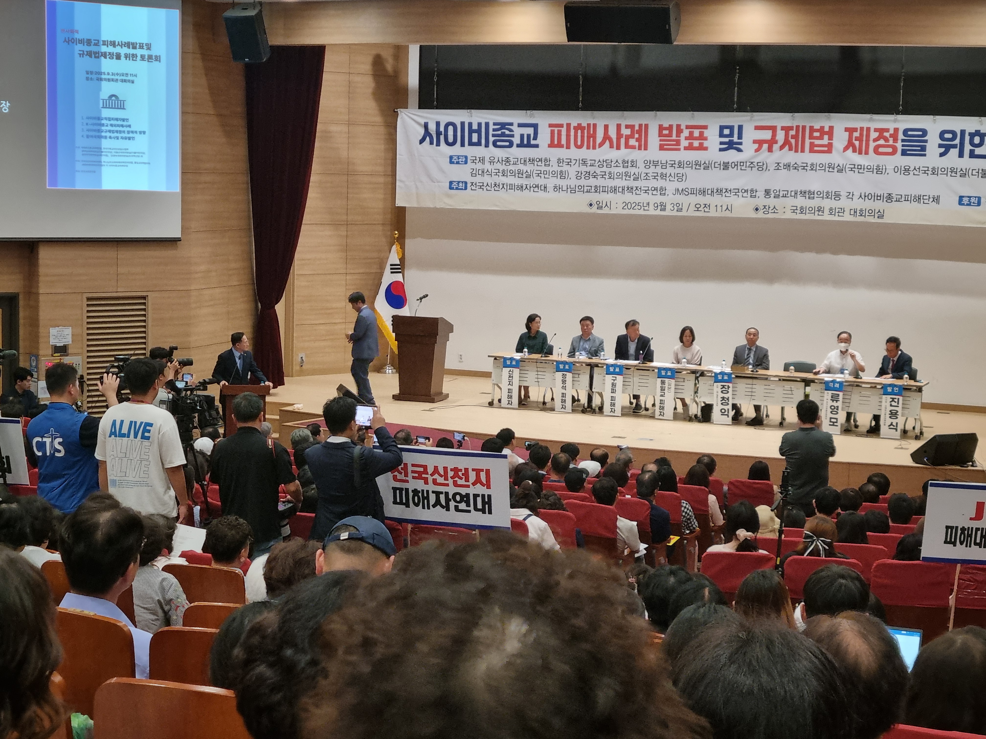 국제유사종교대책연합과 한국기독교이단상담소협회는 국회의원 양부남(더불어민주당), 이용선(더불어민주당), 김대식(국민의힘), 강경숙(조국혁신당)의원실과 2025년 9월 3일(수) 오전 11시부터 12시 30분까지 국회의원회관 대회의실에서 <사이비종교 피해 사례발표 및 규제법 제정을 위한 토론회>를 개최하였다. 이 모임은 전국 신천지피해자연대, 하나님의교회 피해대책 전국연합, 통일교대책협의회 외 각 사이비종교 피해모임에서 주관하였다.
