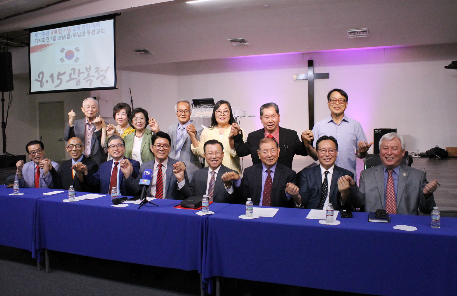 남가주교계연합회가 주최한 제77주년 8.15 광복절 연합예배 기자회견에서 손을 맞잡은 남가주 교계 임원 및 목회자들 ©기독일보
