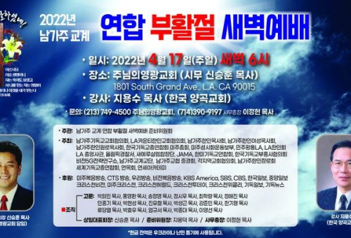2022년도 Los Angeles 새벽 부활절 새벽 연합 예배가 4월 17일 주일 새벽 6시 주님의 영광교회(신 승훈 목사 시무)에서 개최 된다. 강사 : 지 용수 목사(증경 통합측 총회장)공동주관 : 남가주 기독교 교회협의회, 로스엔젤레스 한인 교회 협의회, 남가주 장로 협의회, 남가주 여성 목사회, 미주 성시화 운동 본부 등 *후원 : 세계 한인 기독교 총 연합회, Los Angeles 경찰서 후원회 등. 기도 부탁을 한다고 한다