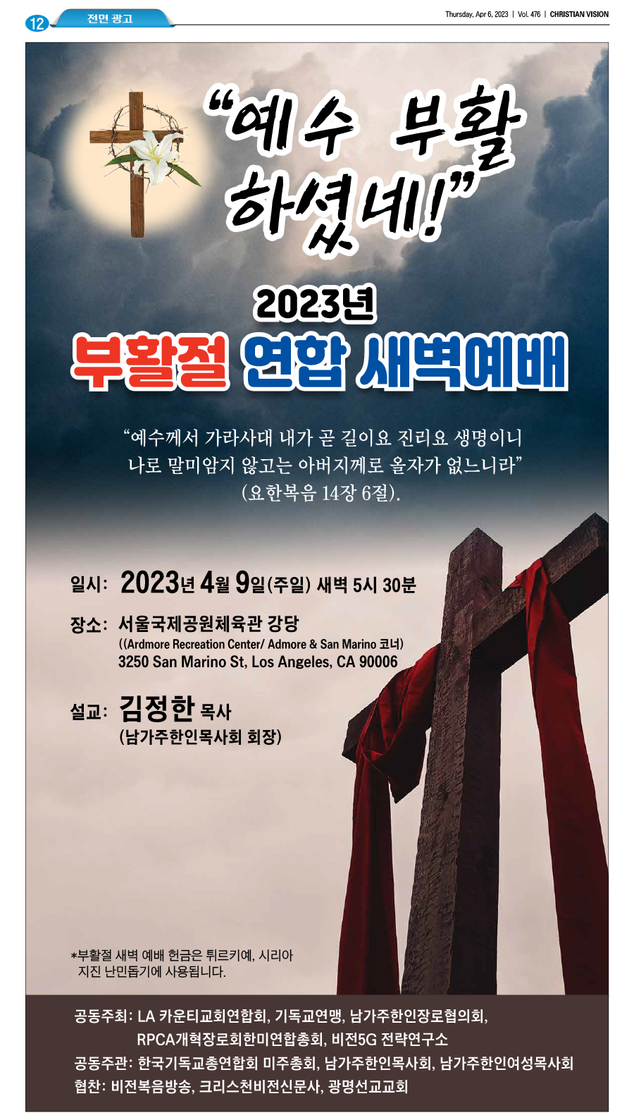 최신뉴스 서울국제공원에서 2025년 부활절새벽연합예배 민족복음화운동본부 국회의사당 시국선언 기자회견 [최선 박사 칼럼] 그렇지 아니한가! 이진삼 전)육군참모총장(전 국방부장관)구국대회 개최 미국 설날 대잔치 백석경 성도의 옥중 편지, 기도요청 [최선 교수 칼럼] 위기에 빠진 대한민국 [긴급속보] 대한민국 대통령 비상계엄령 선포 [최선 박사 칼럼] 일본 고베 외국인 묘지에 잠든 월리엄 스크랜턴 선교사 [속보] 최석호 박사 California주 37지구 상원의원 당선 온라인신문 바로보기 문의/제보 바로보기 최신영상 예수님의 신부들은 영으로 사는자들이다 김의선 목사 새중앙교회 주일예배 서사라 목사 "올 해 한해는 빛나고 깨끗한 세마포를 준비하자" 서사라 목사 "주님은 나는 너의 반석임을 잊지말라라고 말씀 하신다" 대신종합행정센타 건립을 위한 (전국장로회연합하례예배 ) 청빙정보 [감사한인교회] 교구담당 부목사, 교구 및 심방담당 여자전도사 청빙합니다 [선한목자교회] Full-time 부목사를 청빙합니다 사랑의빛선교교회에서 동역자(교구 전임)를 찾습니다. [아름다운 교회] 찬양사역자 청빙 윌셔연합감리교회에서 교육전도사님을 모십니다