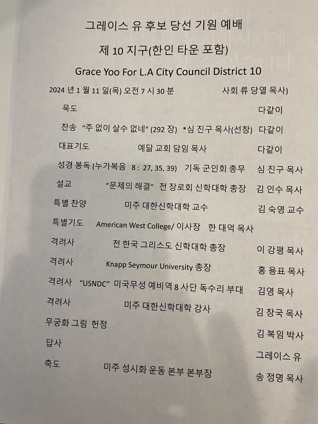 미주교계뉴스 카테고리 전체열린 분류 미주교계뉴스한국교계뉴스사회일반뉴스 [미주교계뉴스] 그레이스 유 후보 당선 기원 예배 진행하다 작성일 : 2024-01-11 목록 페이지 정보 본문 그레이스 유 후보 당선 기원 예배 제10 지구 한인 타운 포함그레이스 유 후보 당선 기원 예배 진행하다 페이스북 공유 트위터 공유 구글+ 공유 이전글마틴루터킹 퍼레이드 LA 경찰국장과 함께 - 본지 발행인 24.01.16 다음글무기수(종신형) 백 석경 성도가 미국 교도소에서 본지 발행인 류 당열 목사에게 2023년 12월 17일 옥중 서신을 보내 24.01.07 댓글 0 댓글목록 등록된 댓글이 없습니다.