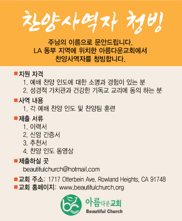 LA 동부 지역에 위치한 아름다운교회에서 찬양사역자를 청빙합니다.