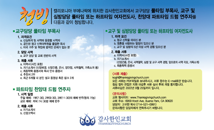 [CA] [감사한인교회] 교구담당 부목사, 교구 및 심방담당 여자전도사 청빙합니다