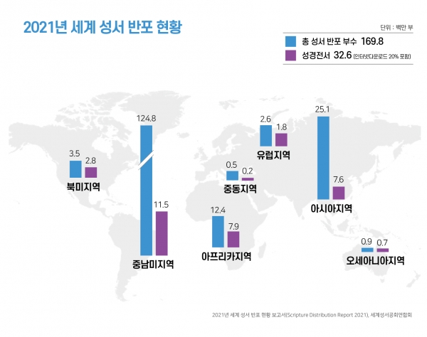 세계성서공회연합회가 발표한 '2021년 세계 성서 반포 현황 보고서'에 따르면 지난해 전 세계에 3천260만 부가 넘는 성경전서가 반포됐고, 신약성서 등 부분 성경까지 합하면 총 1억6천980만 부의 성서가 보급됐다고 대한성서공회(이하 공회)가 7일 밝혔다.